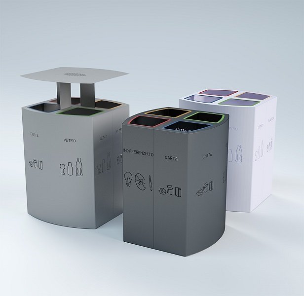 - Coperchio estraibile in acciaio zincato e verniciato, sulla superficie superiore sono presenti 4 anelli quadrangolari colorati per differenziazione raccolta, in acciaio, spessore mm 6/10.