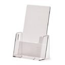 Porta depliant in plexiglass da banco per volantini formato 1/3 di A4. Espositore da tavolo per inserire depliant, cartoline, brochure formato 10x21H cm. Realizzato in polistirene trasparente adatto a tutti gli ambienti. Strumento utile per promuovere la tua attività in ogni occasione. Il fronte del porta depliant può essere personalizzato con un adesivo o con una stampa in serigrafia.