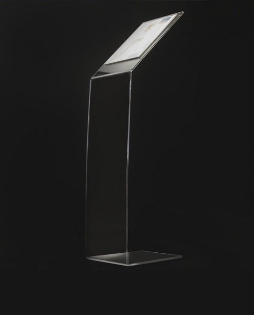 Scheda tecnica Leggio da terra autoportante, interamente in plexi con base a L spessore 8mm. Disponibile con una o due tasche porta comunicazioni in formato A4. Possibilità di personalizzare la struttura con pellicola satinata o con grafica adhoc.