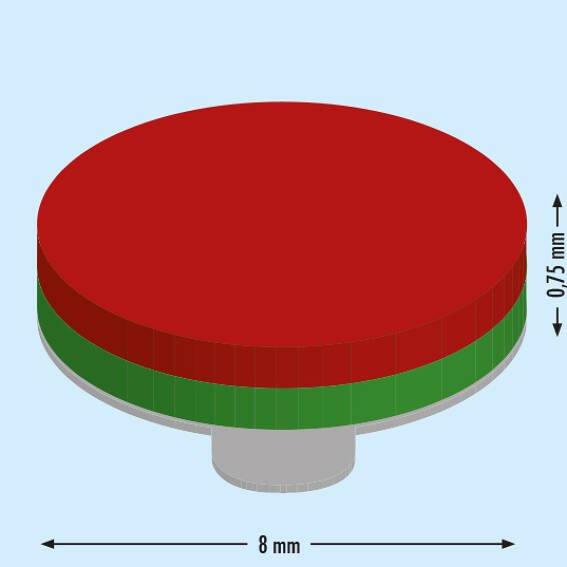 Disco magnetico al neodimio, ø = 8 mm, altezza di 0,75 mm, autoadesivo, neodimio, N35, forza di attrazione ca. 250 g